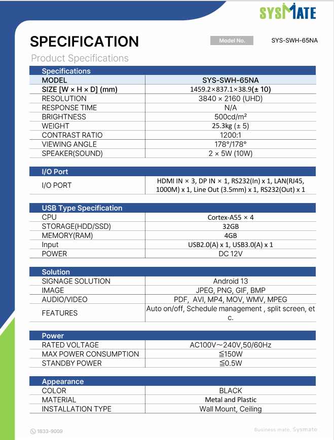 Màn Hình Chuyên Dụng Sysmate 65 inch – SYS-SWH-65NA.