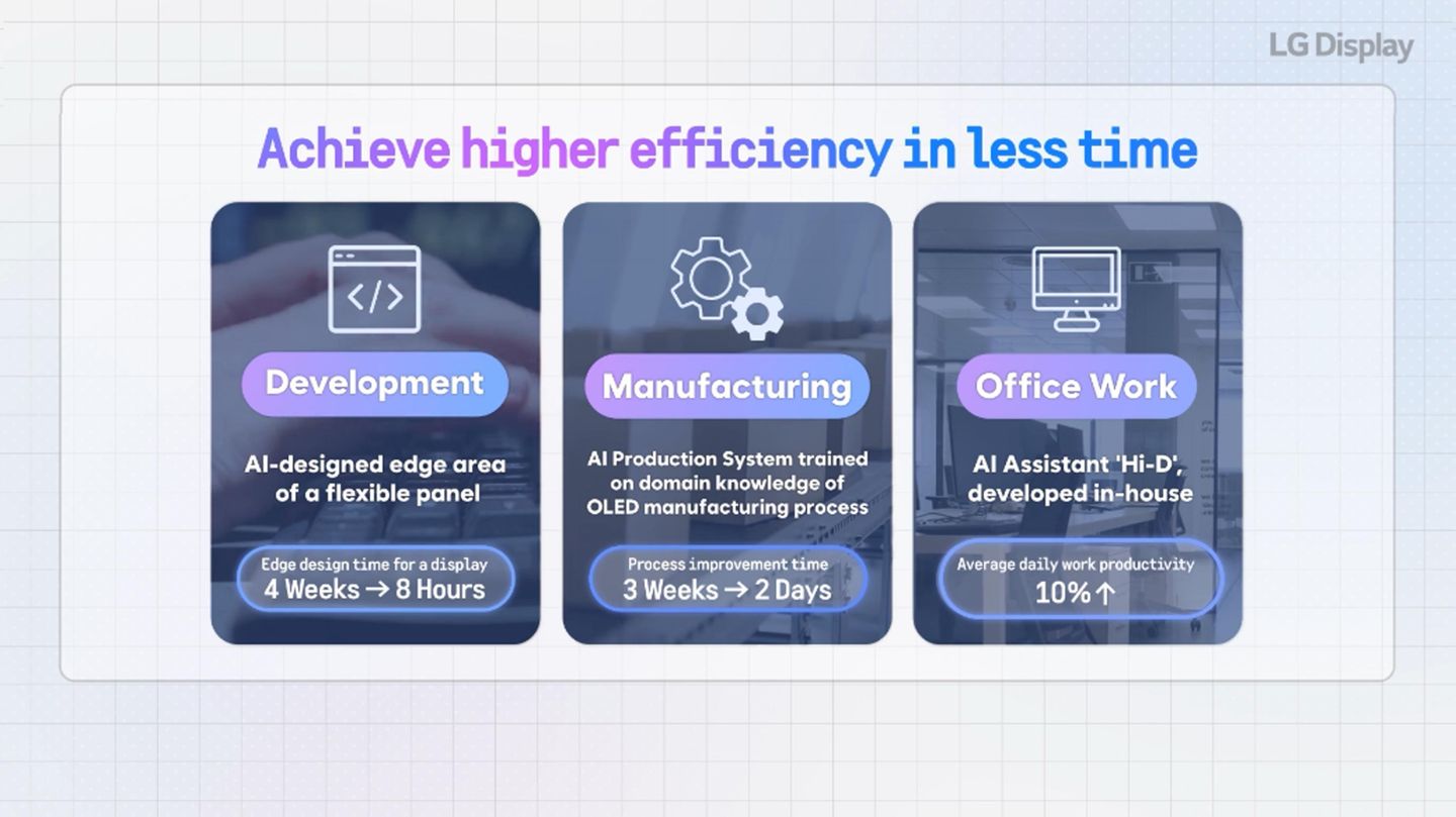 LG Display cho biết họ đã giới thiệu quy trình sản xuất dựa trên AI vào năm ngoái, mang lại lợi nhuận cải thiện hơn 200 tỷ won (144,4 triệu đô la) nhờ năng suất được nâng cao. Công ty cũng đã phát triển hệ thống trợ lý AI riêng, tiết kiệm hơn 10 tỷ won so với việc áp dụng các giải pháp bên ngoài.